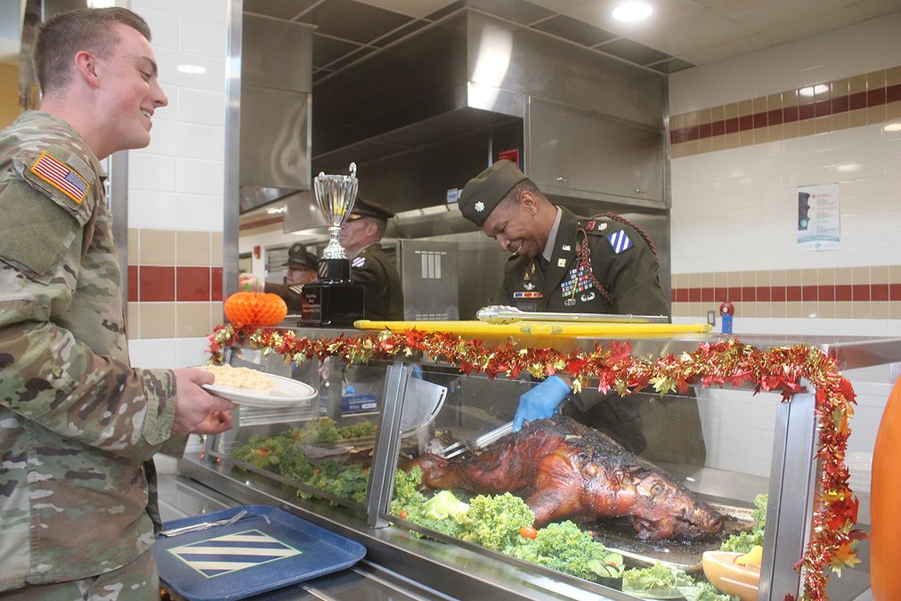 The division’s dining facilities served turkey and all the fixings, along with a steamship round, crab legs and at the 2nd Armored Brigade Combat Team’s serving line, there was a roasted pig waiting to be carved and served.