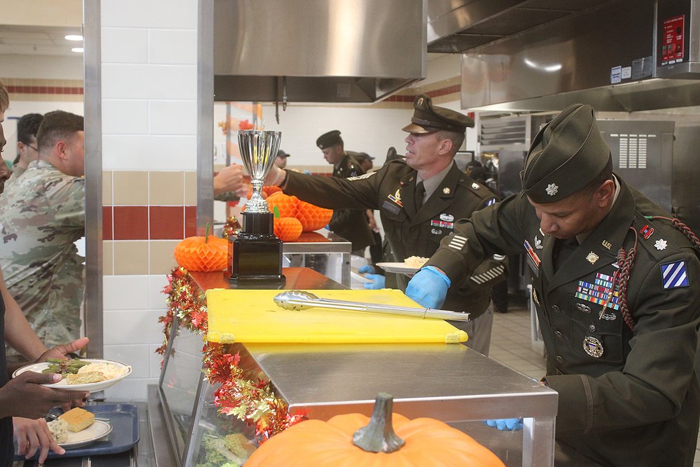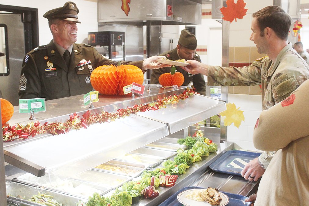 Thousands of miles away in Europe, and in the dining facilities on Fort Stewart, 3rd Infantry Division soldiers lined up, as senior division leaders placed a Thanksgiving meal’s fare on their plates.