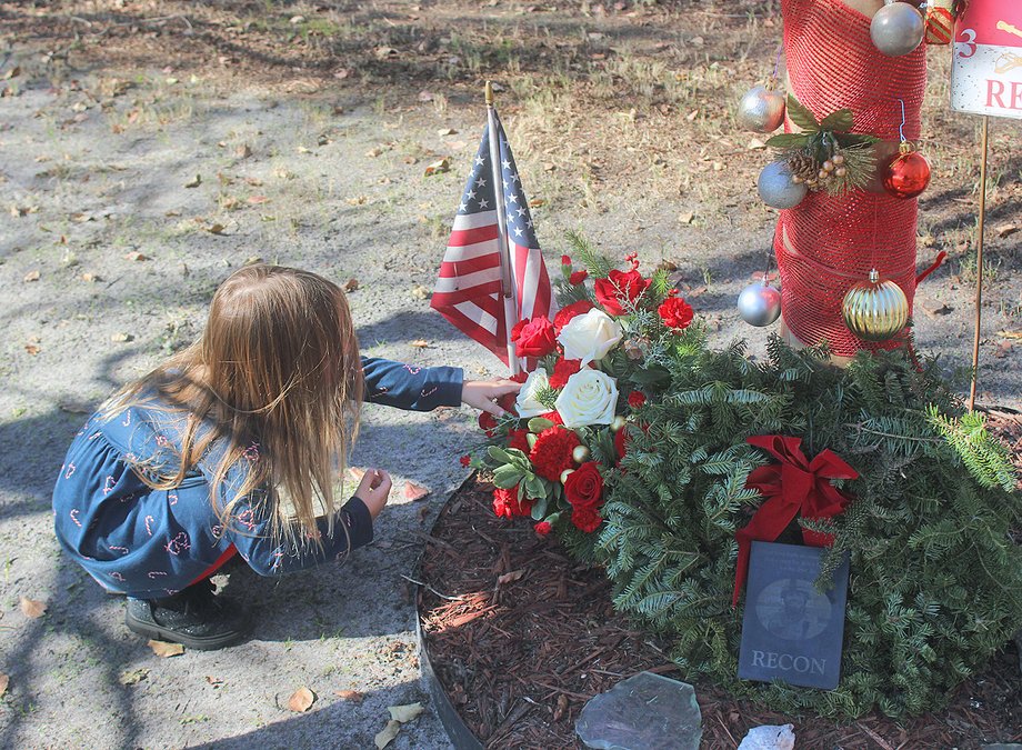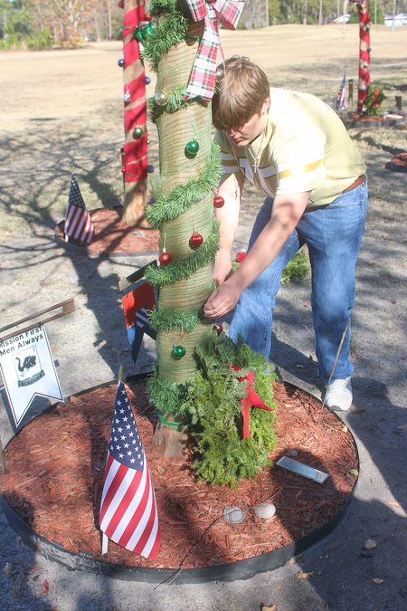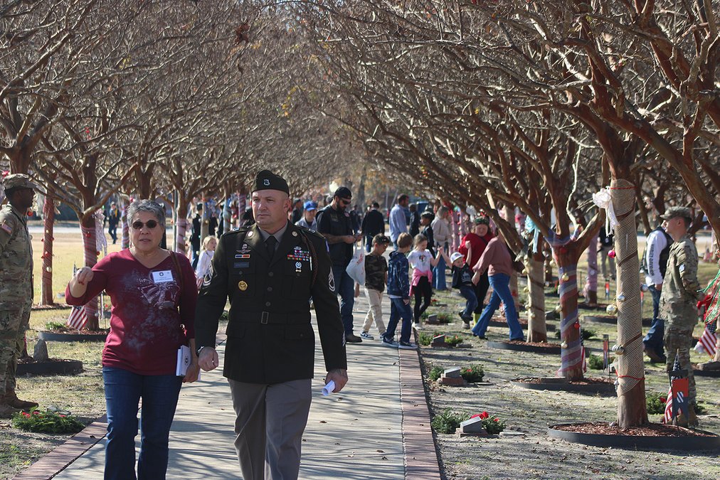 For the last 19 years, volunteers have made sure a Christmas wreath is placed along every marker along Warriors Walk. There are 469 soldiers honored along Warriors Walk, which borders Cottrell Field with its rows of crepe myrtles Twenty-one Gold Star families were on hand Saturday.